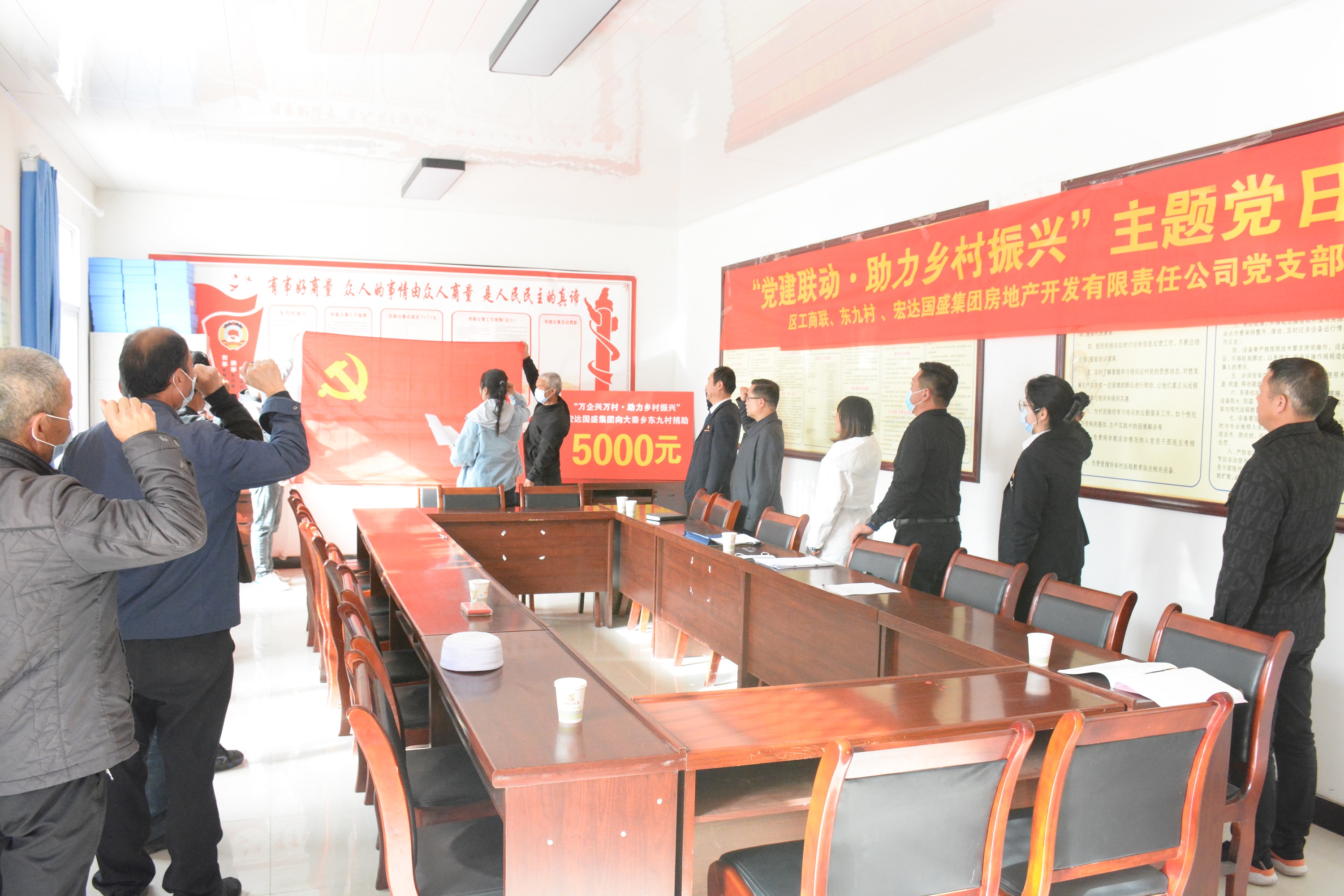 2022年4月22日,宏達(dá)國(guó)盛集團(tuán)為貫徹落實(shí)“萬(wàn)企興萬(wàn)村”活動(dòng),積極參與區(qū)工商聯(lián)組織的“黨建聯(lián)動(dòng)·助力鄉(xiāng)村振興”主題黨日活動(dòng)。集團(tuán)公司黨組織黨員代表3人參與大秦鄉(xiāng)東九村深入開(kāi)展“振興鄉(xiāng)村”村企結(jié)對(duì)幫扶共建,開(kāi)展愛(ài)心捐贈(zèng),助力鄉(xiāng)村振興活動(dòng)。區(qū)工商聯(lián)副主席李文生,大秦鄉(xiāng)東九村村支部書(shū)記云歡及村民黨員代表一同參加本次捐贈(zèng)儀式。