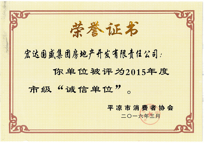 宏達(dá)國盛集團(tuán)房地產(chǎn)開發(fā)有限責(zé)任公司榮獲2015年度市級“誠信單位”